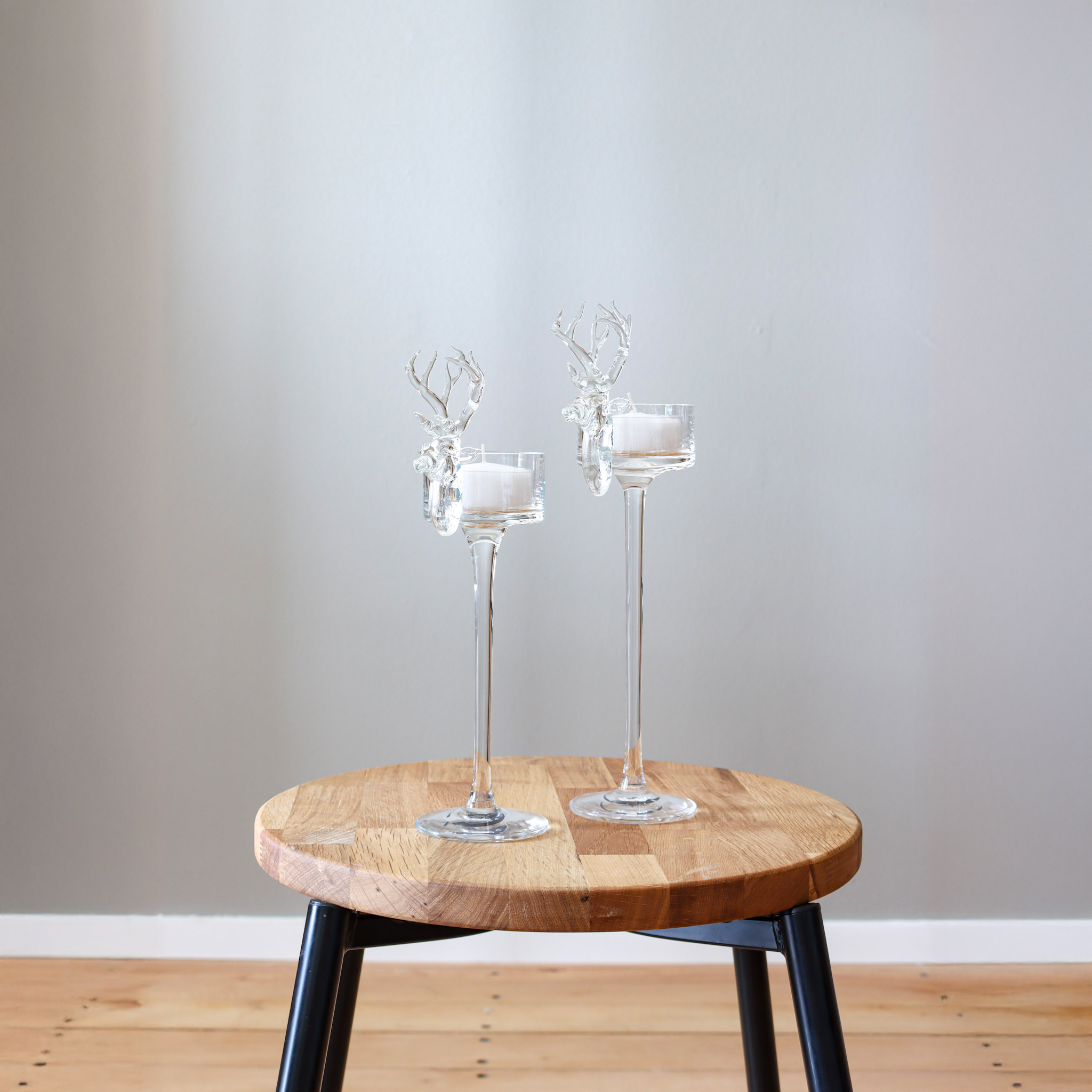 Handgefertigte Kerzenständer aus mundgeblasenem Glas. Schlichte Erscheinung mit Hirschkopf als Eyecatcher.